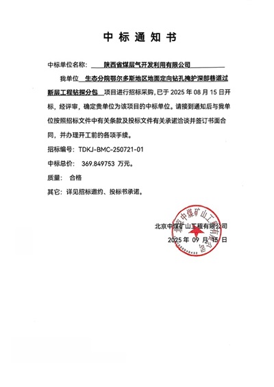 鉆井分公司中標張家峁水文地質探查工程2025-09-24